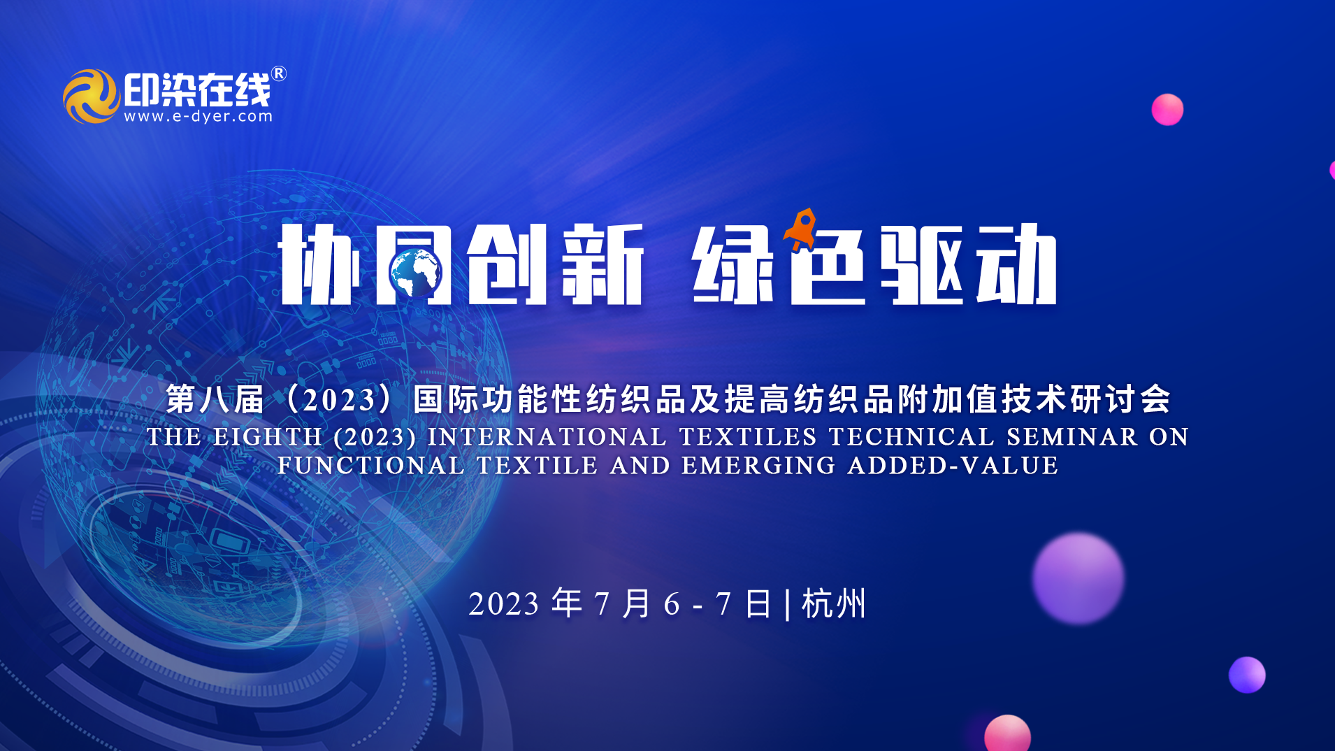 全球通胀压力加剧,需求收缩、经济衰退威胁加大、订单转移、原材料和能源成本上涨、持续的供应链挑战等多重复杂环境相互交织。2023年对全球纺织产业无疑是充满挑战的一年。纺织品供应链企业加速向“高质量”、“高效率”、“高竞争力”转型升级需要全产业链协同创新,新型绿色功能性材料将会成为纺织品附加值提升的重要增长利器。为深化纺织品向功能、绿色、健康、舒适、时尚与智能融合,促进纺织产业链向价值链高端提升,为纺织印染产业链创造更高效的技术交流平台,由印染在线主办的“协同创新・绿色驱动”第八届(2023)国际功能性纺织品及提高纺织品附加值技术研讨会将于2023年7月6 - 7日在浙江省杭州市召开。