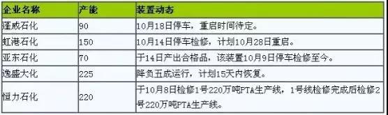 虽然国庆假期后,PTA装置检修力度非常大,开工率下调了4.16%,能够起到一定的去库存效果。但另一方面,PTA新装置投产已近在眼前。