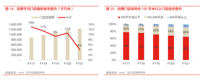 以滔搏为例,在FY20后门店数量下降的背景下,门店面积在FY20和FY21分别同比增长11%和4%,从门店结构来看,150平米以上的门店数量占比逐年提升,从FY17的23%提升至FY21的35%。