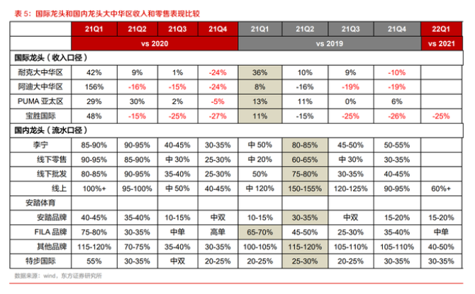 国内品牌:考虑到22Q1国内品牌较为强劲的流水表现、以及坚实的基本面支撑(下文详细阐述),叠加宝胜国际22Q1疲弱的收入表现(22Q1同比下滑25%,对比19Q1下滑17%),我们认为国内品牌有望延续国产替代进程,市占率继续提升。