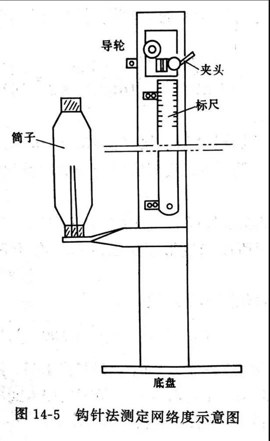 在细钢针的两端各悬挂相当于纤度1/5荷重的砝码,使钢针以2cm/s的速度下落,记下钢针下落的距离。重复做50~100次上述试验,求出钢针50次或100次下落距离平均值X,取它的倒数即为网络度。