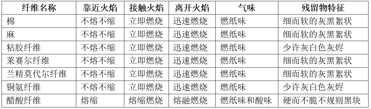 其中醋酸纤维燃烧特征比较明显,需经显微镜观察法进一步确认即可。