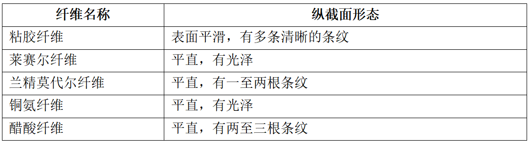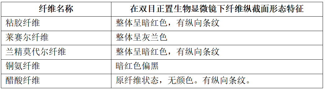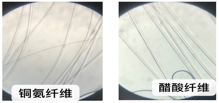 在双目正置生物显微镜下,可区分莱赛尔纤维和铜氨纤维,及兰精莫代尔纤维和醋酸纤维。