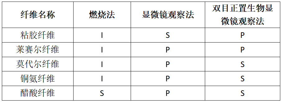 表5 五种再生纤维素纤维所用鉴别方法 注:S:可鉴别 P:初步确认 I:不可鉴别