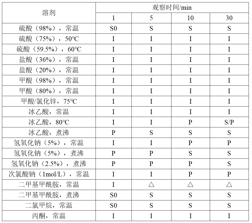 对聚乳酸纤维进行化学溶解试验,观察聚乳酸纤维在一定温度、溶解时间条件下,在一定的酸、碱、盐及有机溶剂中的溶解状态,具体见表1。