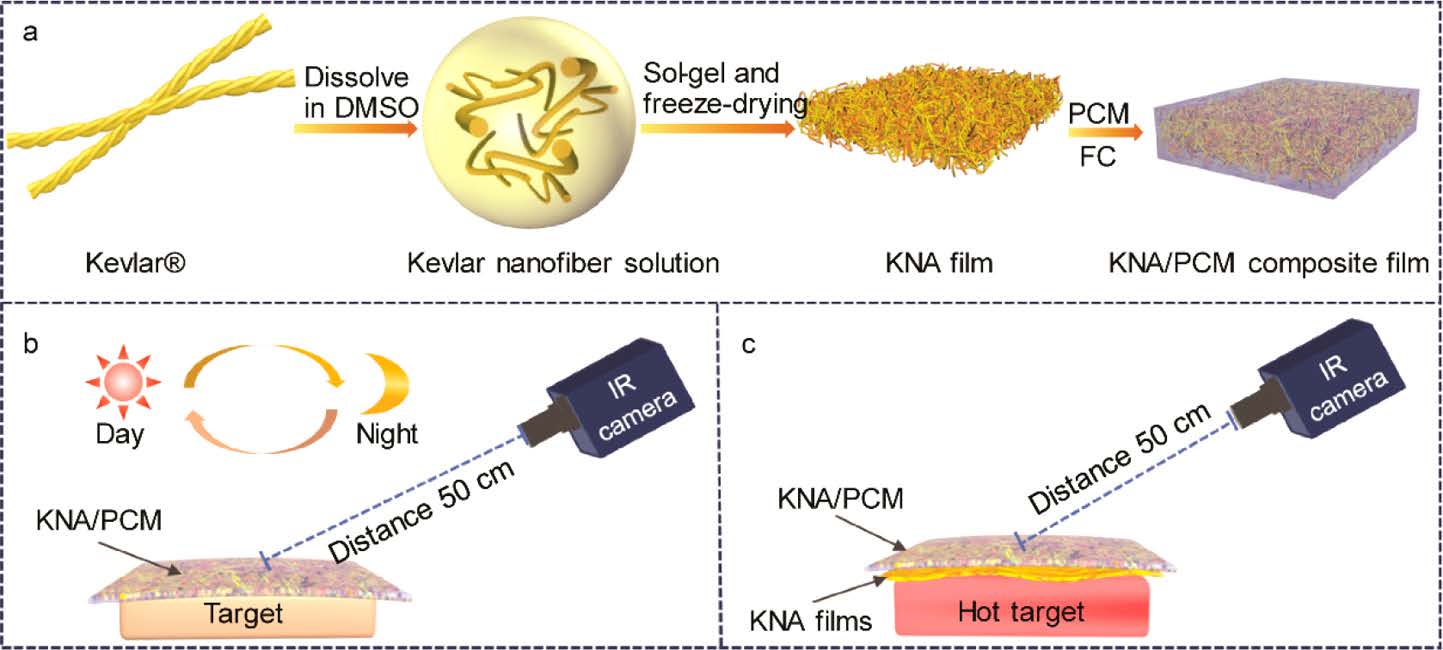 同时,该研究团队提出了气凝胶隔热层与相变复合薄膜叠加的组合结构实现发热物体红外隐身的结论:Kevlar气凝胶薄膜具有优异的隔热性能,根据目标与环境之间的温度差异,选择合适层数或者厚度的气凝胶层,可将温度降低至与环境温度匹配;相变复合薄膜具有低红外透过率,高温目标发射的红外光无法透过。因而覆盖这种组合结构的高温目标在红外照片中也能实现隐身。