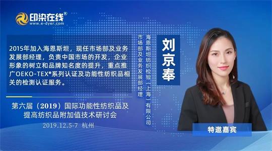 由印染在线主办的“赋能升级 智造未来”第六届(2019)国际功能性纺织品及提高纺织品附加值技术研讨会将于12月5-7号在杭州召开。本次研讨会特别邀请海恩斯坦纺织检验(上海)有限公司市场部及业务发展部刘京奉经理为大会嘉宾分享《OEKO-TEX®助力打造绿色可持续纺织供应链》。
