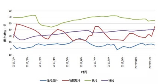 氨纶、涤纶库存两级分化:从库存角度看,2019年,氨纶丝库存全年平均值在46天,1~2月、7~9月其平均值在50天以上。氨纶丝的库存高企,主要是因为今年的氨纶价格逐步下跌,虽然产量保持稳中有涨,但下游织造厂以及圆机厂使用氨纶量有限,造成了氨纶库存全年高企。粘胶短纤行业全年平均库存在23天附近,其中5月、8月两个月其库存天数较低,进入第四季度后,库存天数逐步上升,达30天以上。这主要是因为进入第四季度后,粘胶短纤的产量开始增加,但是销售量有限所致。锦纶行业全年平均库存在24天附近。涤纶短纤行业全年平均库存在6天附近,在所有的化纤品种中,属于低位运行状态,这主要是因为涤纶行业在整个化纤行业中所占有的比例较大,该行业的销售政策较为灵活,且各企业都主动控制其产销率,故该行业库存基本保持低位运行状态。