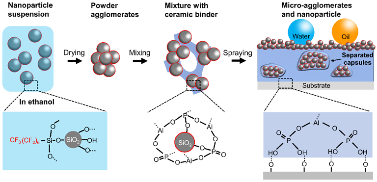 课题组团队通过底面合一及喷涂的工艺,以全氟氯硅烷为改性剂制备出高接枝率的功能纳米颗粒,引入磷酸二氢铝为无机粘结剂,通过化学键合增强颗粒间的结合力,同时,功能颗粒在涂覆过程中的相分离和再团聚能显著提高涂层体系的机械耐久性,粘结剂也能提高涂层的内聚力,以及与基底的附着力,示意图如图1。该方法工艺设备简单,利于规模化批量制备,有较大的工业应用优势。