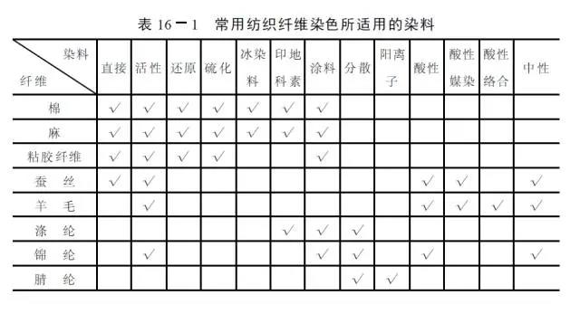 组成织物的纤维原料是染料选择最基本的依据。常用纺织纤维染色所适用的染料。(见表16-1所示)