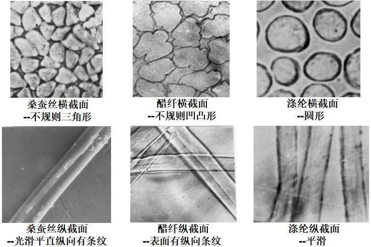 桑蚕丝横截面呈不规则三角,醋酯纤维横截面呈不规则凹凸,二者的纵截面都有纵向条纹,使其横向光为漫反射,纵向光亦为漫反射。折射率较低,为1.48。所以桑蚕丝和呈现出珍珠般柔和的光泽。