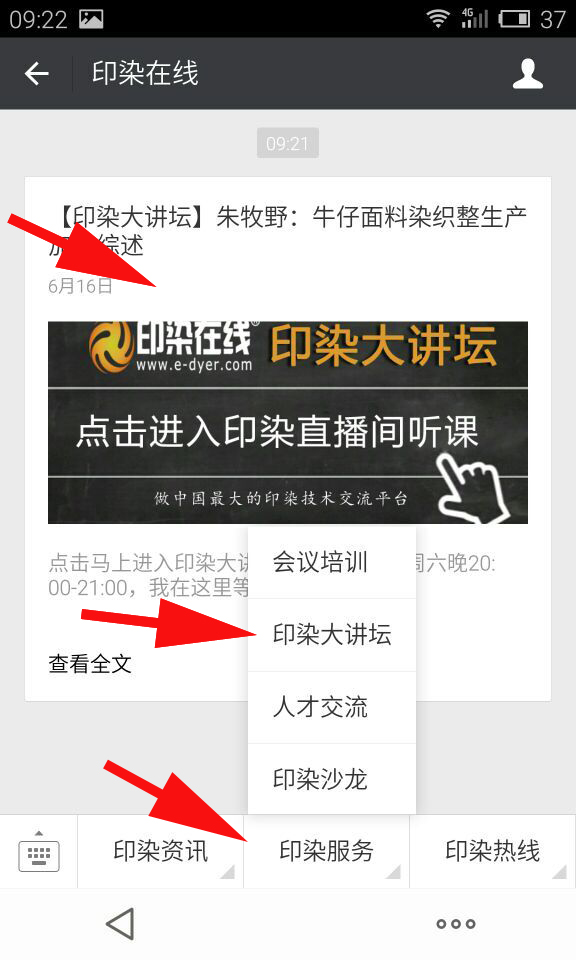 2、点击“印染服务”栏目,进入“印染大讲坛”或者直接点击推广页进入。